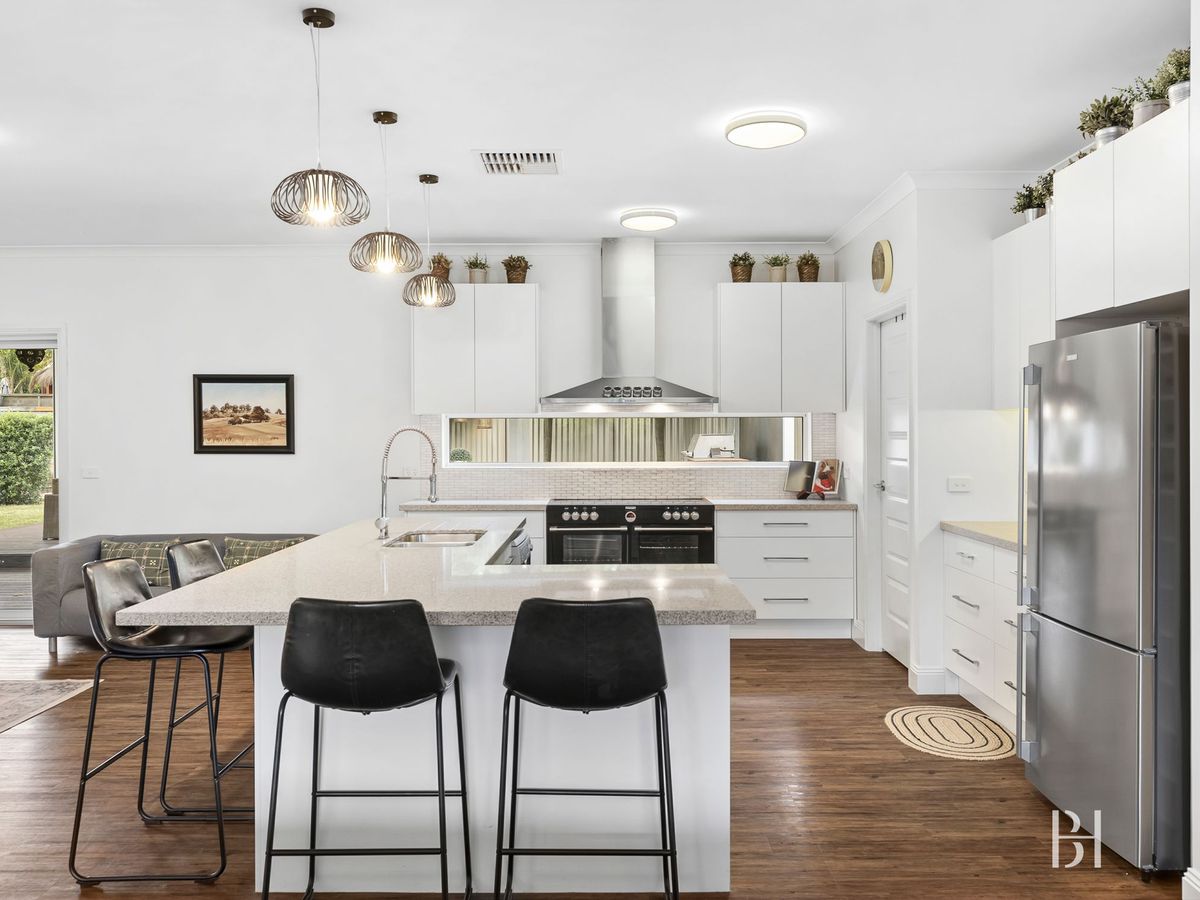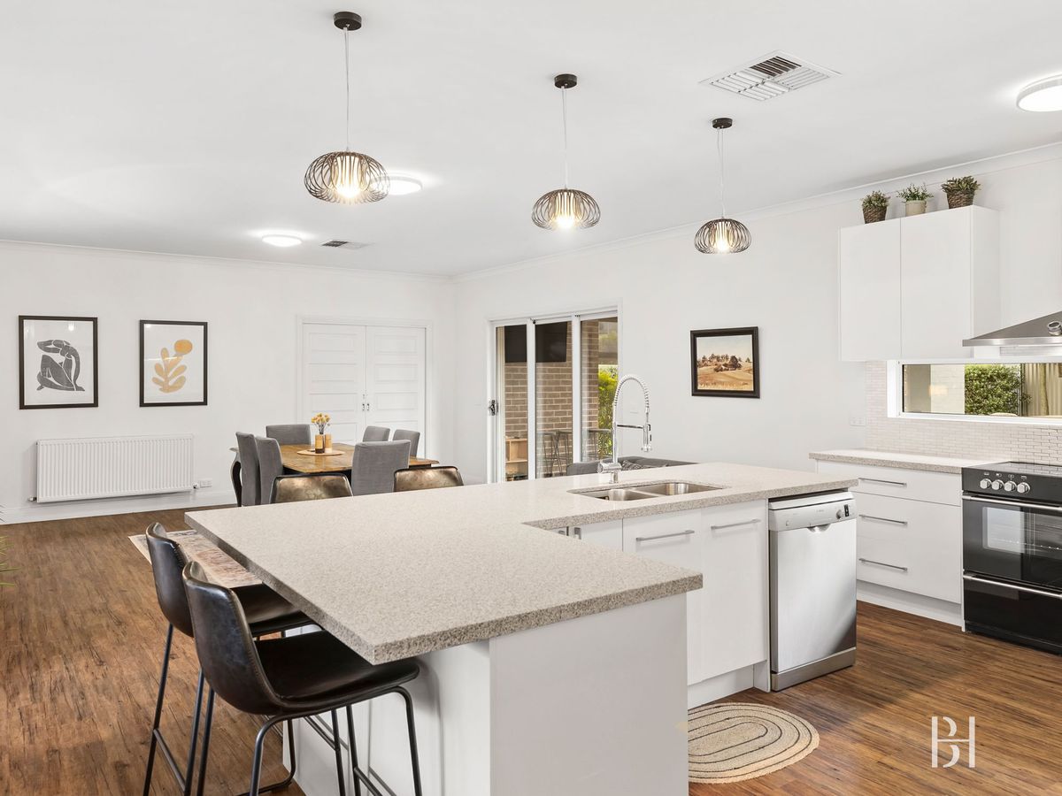 At the heart of the home, the kitchen flows effortlessly into the dining and living zones, creating an inviting hub for both living and entertaining alike. Featuring a walk-in pantry, statement oven, a stone-topped island bench come breakfast bar and quality stainless steel appliances, the kitchen is both stylish and highly functional. Hydronic heating and evaporative cooling ensure year-round comfort, reinforcing the sense of quality and care that defines the home.